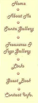 * * * Home * About Me * Santa Gallery * Treasures & Toys * Links * Guestbook * Contact Info * * * This page was last updated by my webmaster-grandson, Anthony on February 23, 2002. * Professional website hosting compliments of Wright Brothers Webhosting *