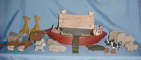 Many Victorian children were only allowed to play with Bible related toys on Sundays. My version of this "Turn of the Century" toy includes: The Ark, approximately 16" long, Noah, and Mrs. Noah, and 36 animals. All pieces of this set have been gently aged to look as though they have just been discovered in a "long forgotten trunk"! This set took over 100 hours to make, and will be a wonderful display piece for years to come. $ 550.00