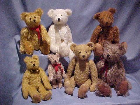 My hand sewn teds are made of mohair, 5 way jointed and are available in different colors and sizes. These are made to resemble the antique Steiff Bears. They range in size from 8" to 14". Price range is from $65.00 to $135.00