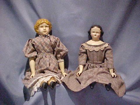 Hand made replicas of paper mache dollies from the 1880's. They are approximately 20" long. Contact me if you have a color preference for dress. These dollies are aged and distressed to look old. $ 95.00