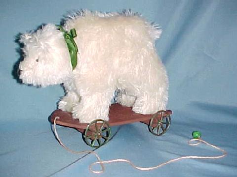 Hand sewn mohair bear pull toy, resembling the antique Steiff ones. They are on a wooden basewith pewter wheels. They are 8" high, by 11" long, and can be made in brown, if preferred. $95.00