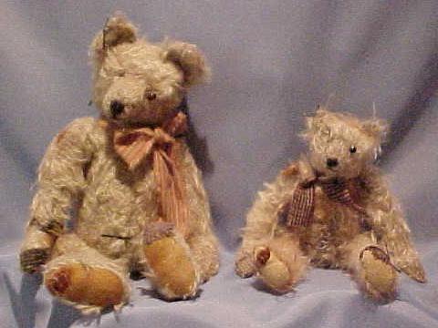 These hand sewn mohair bears are 5 way jointed, distressed and aged to give the very loved look of a favorite old Steiff bear. They have one eye and patches here an there with "excelsior" stuffing showing. They range in size from 8" to 14". Price range is from $65.00 to $135.00
